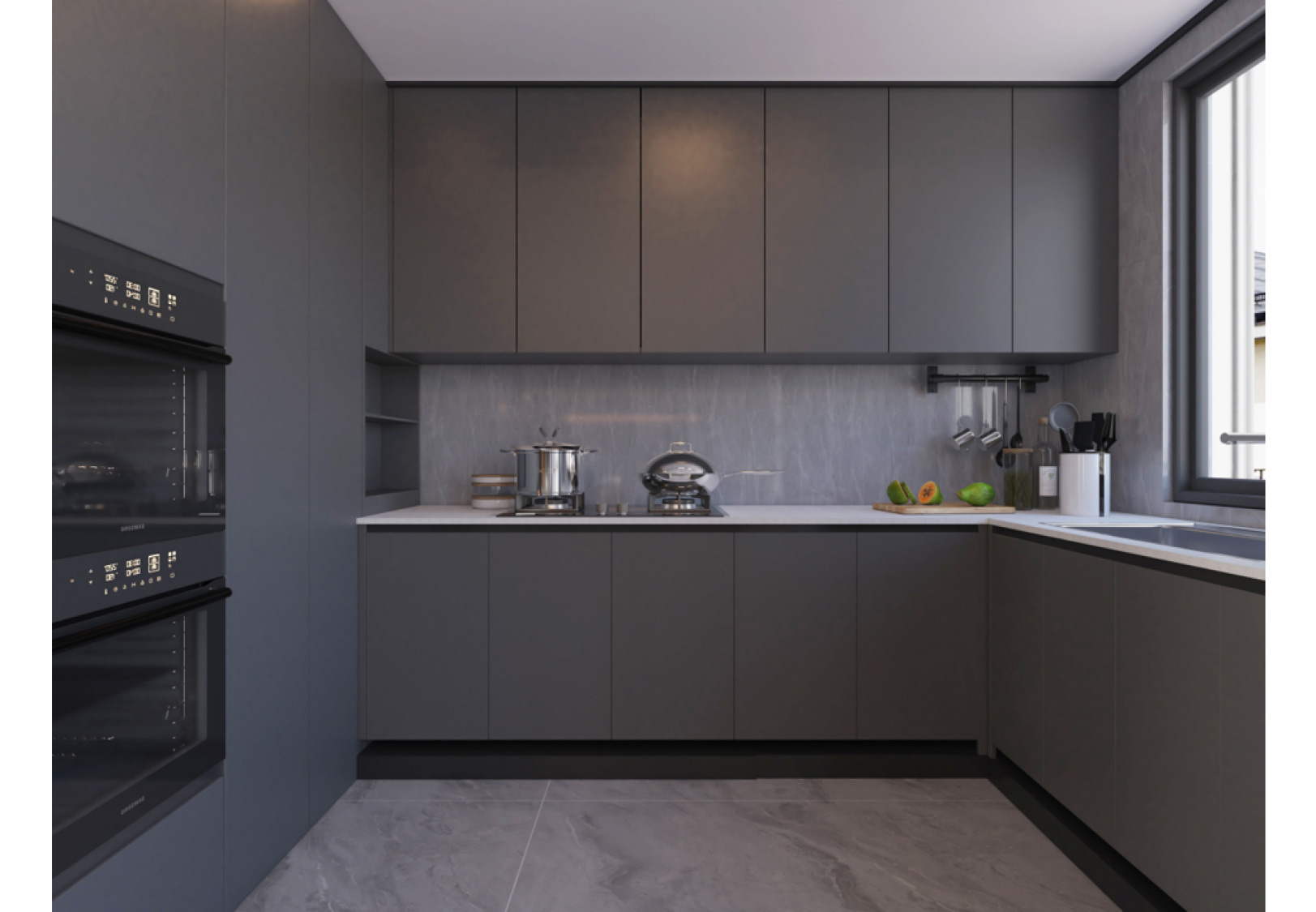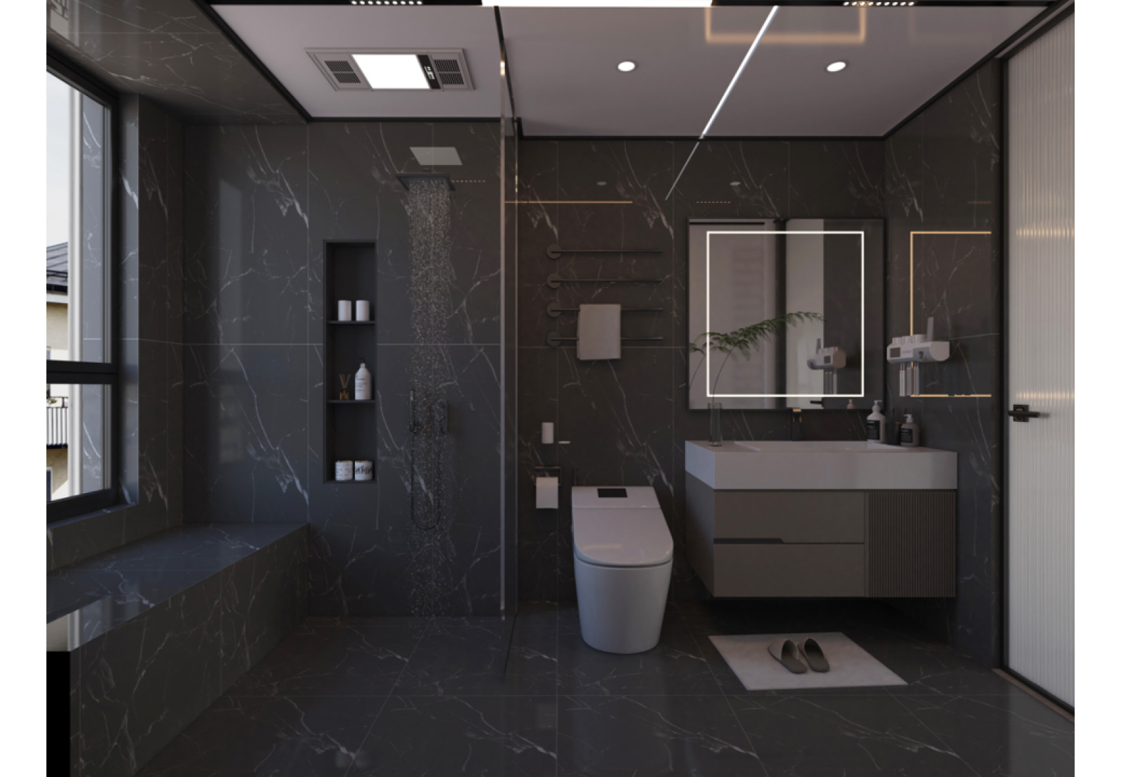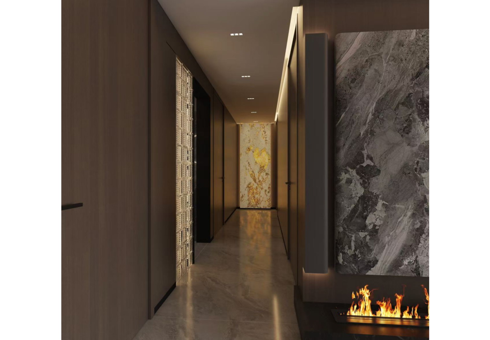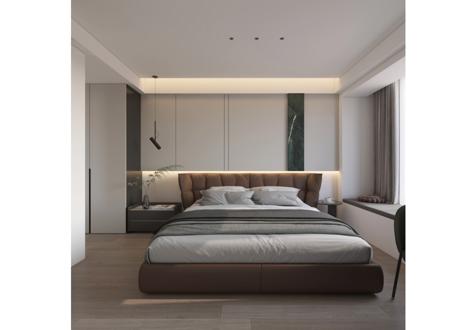 本案例整体采用中性色调,内敛干净,奢而不华。以高级灰色调于亮面光感相互调和,辅以奢石的用材,将豪华与舒适融合在一起,营造一种大气、低敛的视觉效果。