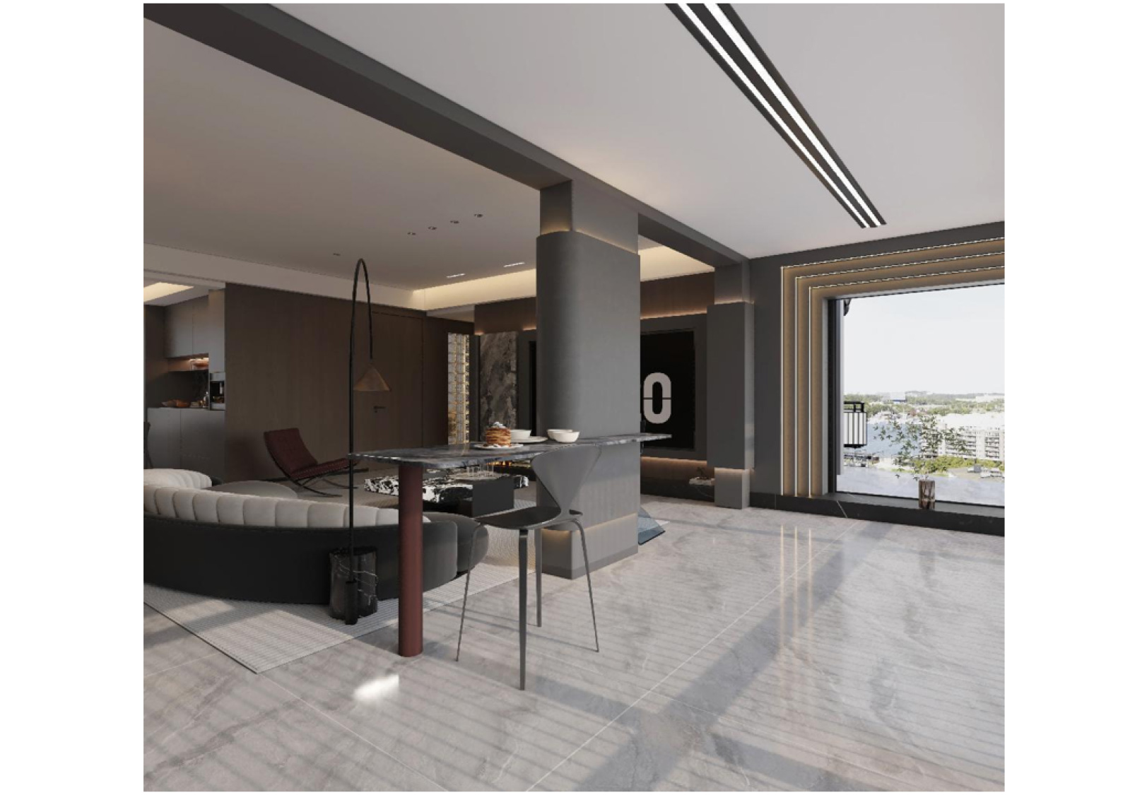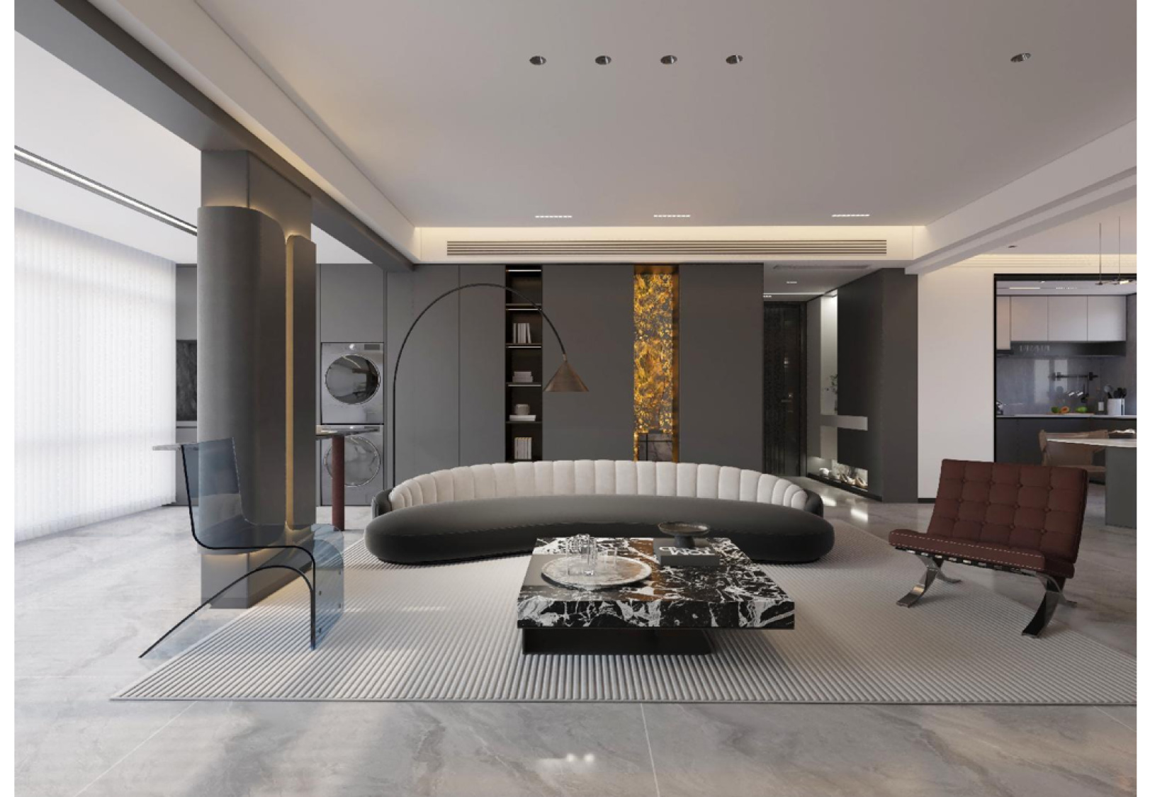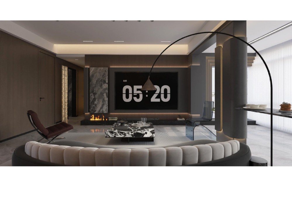 本案例整体采用中性色调,内敛干净,奢而不华。以高级灰色调于亮面光感相互调和,辅以奢石的用材,将豪华与舒适融合在一起,营造一种大气、低敛的视觉效果。
