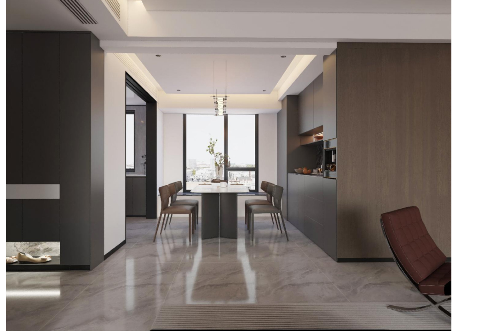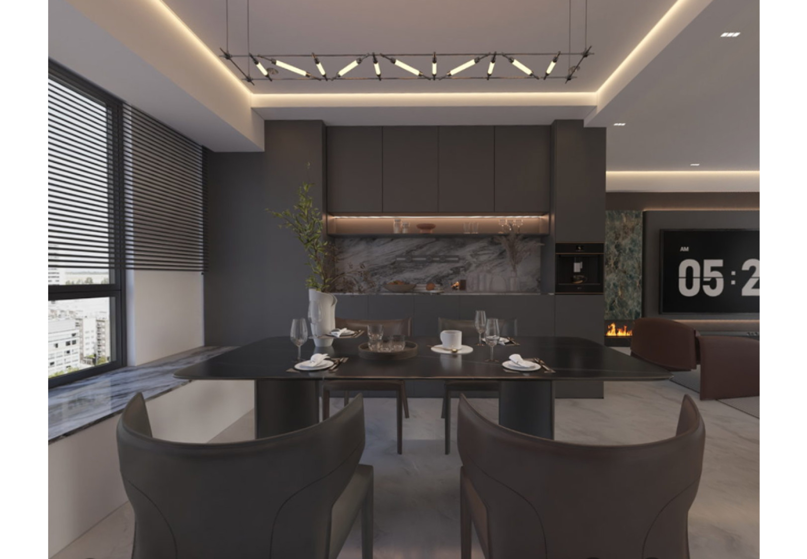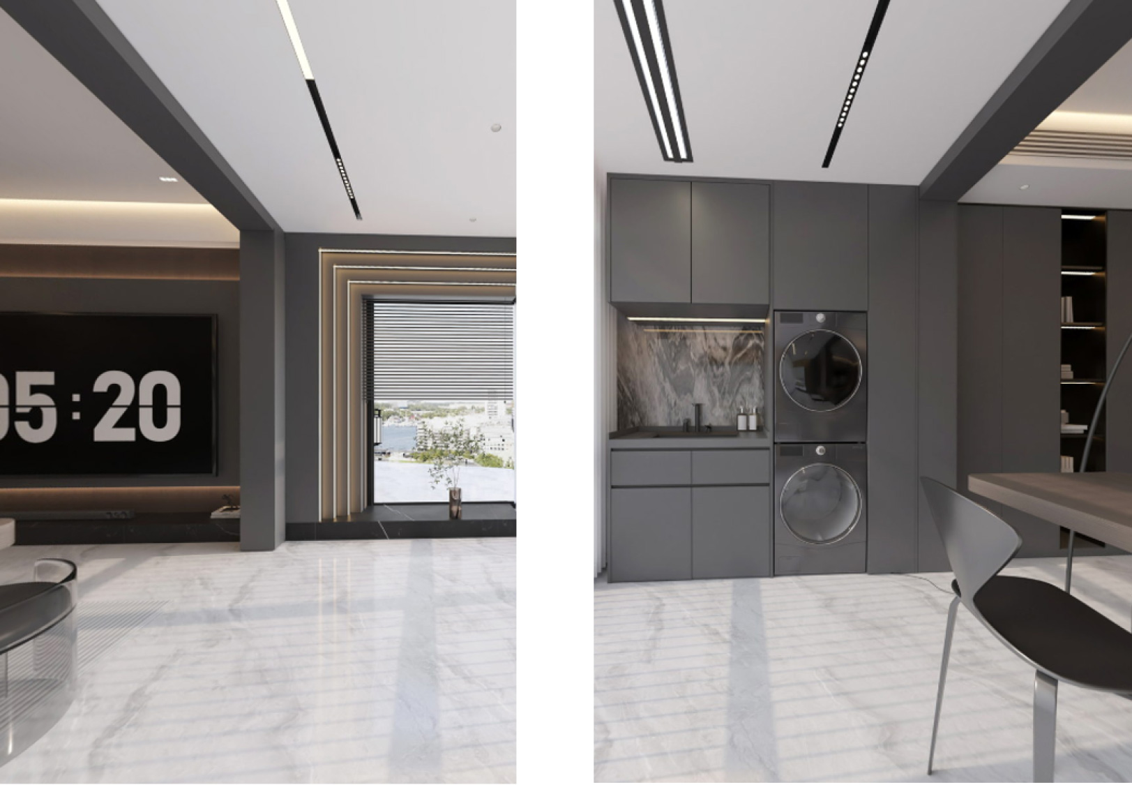 本案例整体采用中性色调,内敛干净,奢而不华。以高级灰色调于亮面光感相互调和,辅以奢石的用材,将豪华与舒适融合在一起,营造一种大气、低敛的视觉效果。